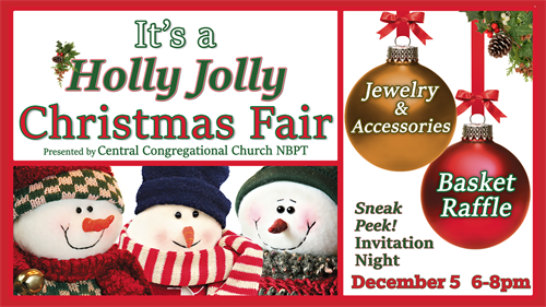 The Central Church Christmas Fair is on December 6th from 9 am to 2 pm. But on Friday, December 6th you can get a jump start on the famous Basket Raffle and Jewelry & Accessory Wonderland. Get “first dibs” in the Wonderland, plus preview all of the amazing baskets available and get your raffle tickets.